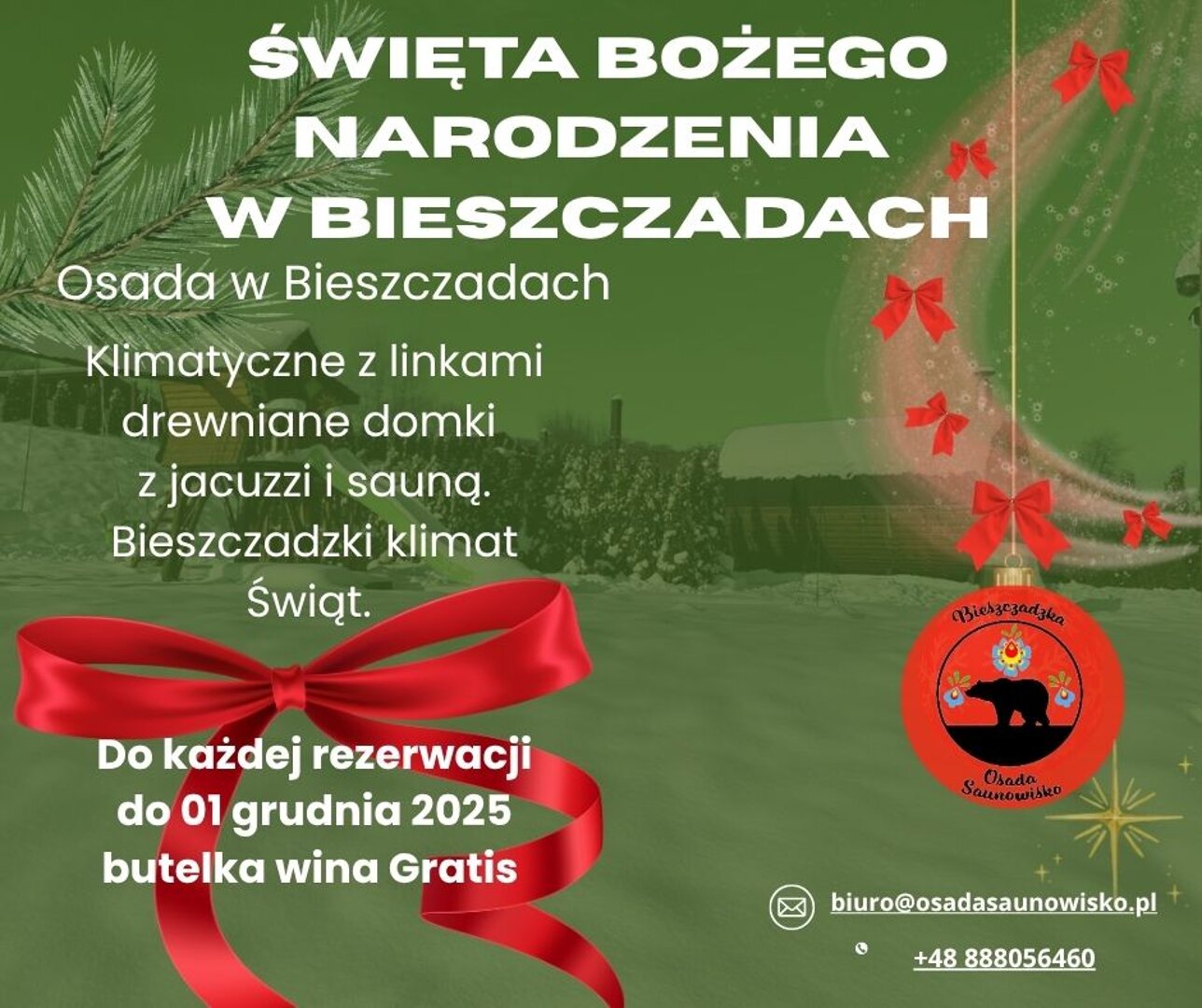 Domki na Sylwestra w Bieszczadach – powitaj Nowy Rok w ciszy i klimacie natury, butelka wina na powtanie.